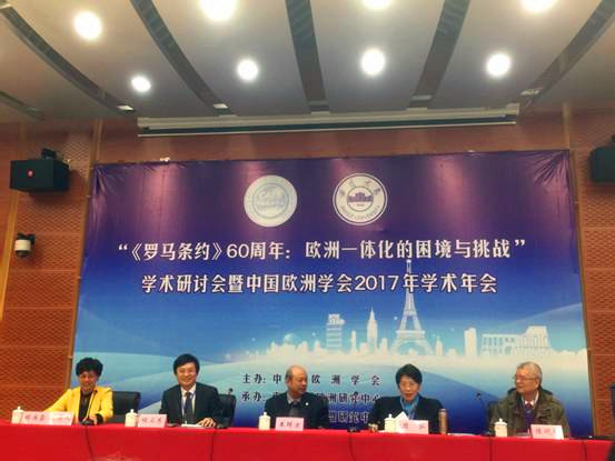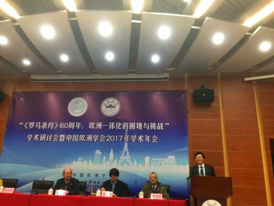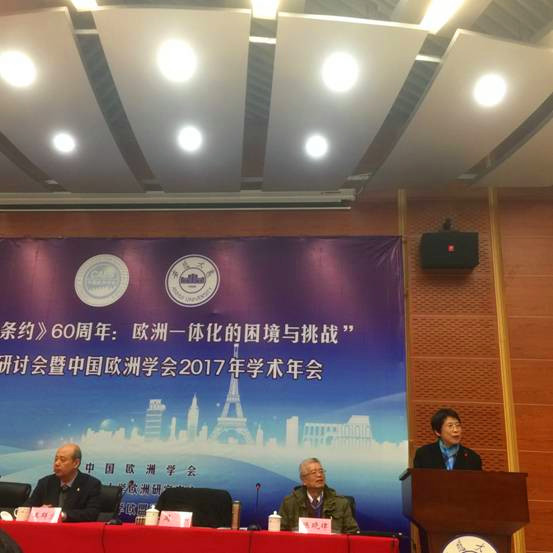 2017年4月14日-15日,由中国欧洲学会主办,安徽大学欧盟研究中心和南京大学欧洲研究中心承办的“《罗马条约》60周年:欧洲一体化的困境与挑战”学术研讨会暨中国欧洲学会2017年学术年会在安徽大学成功举行。来自外交部、商务部、中国社科院欧洲研究所、英国威廉希尔公司、北京外国语大学、中国人民大学、复旦大学、同济大学、南京大学等单位的代表和专家学者参加了会议。会议围绕“英国脱欧与欧洲一体化的未来”、“中欧经贸合作与外交关系”、“欧洲难民危机和民粹思潮的复兴”、“欧洲联盟的双边与多边外交”、“欧洲社会发展”等六大主题进行了广泛而深入的探讨。我校欧洲研究中心主任周弘教授,理事程卫东教授、丁纯教授、俞森林教授及欧洲研究团队成员张杨博士参加了此次会议。