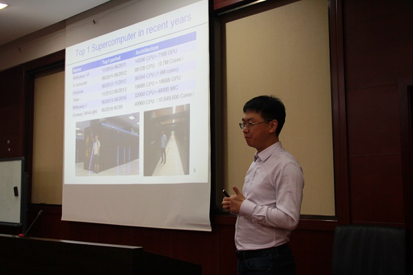 首先,崔涛老师从高性能计算机的变革过程作为切入点,举例展示了从第一台我国自主研发的“神威之光”16核到如今“神威太湖之光”260核的变化,并就高性能计算机和易购计算机的差别进行了对比。为做灾害评估和探测地质,崔涛老师给我们分享了一个地震模拟模型,针对区域尺度地震波模拟,针对异构体系结构特点设计了的一种高效的谱元离散格式,并在“天河2号”以及“太湖之光”上进行了大规模数值试验,数值结果展示了新格式的高效性及并行可扩展性。在大数据应用研究方面,崔涛老师先是以神经元的输入与输出作为类比讲述大数据的结构,并就酒店收益管理方面进行举例,即基于酒店行业相关的大数据(在线订单、检索、用户评价、航班信息、天气信息、展会等信息),重新定义了酒店的收益管理模型,崔涛老师和他的团队提出了一套高效的酒店数据处理和最优定价模型和算法,基于数据分析来做竞争对手的预测,优于收益管理经理通过主观定义权重而制定的策略。并在北京某酒店进行实验,该酒店较历史同期多取得了约40%的收益,高效算法能利用GPU计算平台实现以2小时为间隔进行定价。这是大数据在生活中的实际运用,也是能够反映出其技术效益的真实案例。