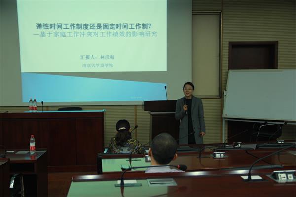 接着,由南京大学博士生林彦梅分享关于“弹性时间工作制度还是固定时间工作制——基于家庭工作冲突对工作绩效的影响研究”的研究经验。讲座一开始,林博士提出了自己寻找新问题的两个突破口:一是阅读文献发现不足;二是从生活现象中寻找并提炼。接着,她向大家分享了一些关于如何发表论文的小技巧,即注重论文中变量的因果关系、同源方差问题和可靠量表。林博士认为研究者如果能在论文中尝试一些较新的变量、理论或方法能够使文章更加有趣并具备创新性。随后,林博士向大家详细介绍了自己关于工作家庭交互领域的研究工作,她阐明了一些概念性的界定,研究假设及研究模型。最后,林博士提到自己未来会向智能手机的使用这一方向开展相关研究,探索智能手机的使用对人的学习工作会产生什么样的影响。在讲座末尾,在场老师针对论文中心理渗透的概念、弹性工作能力的界定以及样本选择等向林博士进行了提问并得到了细致的解答。